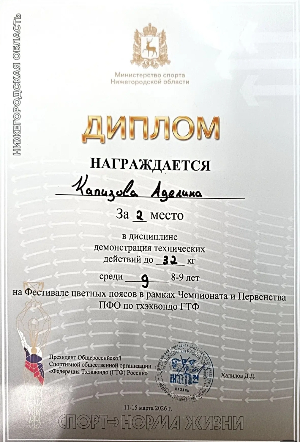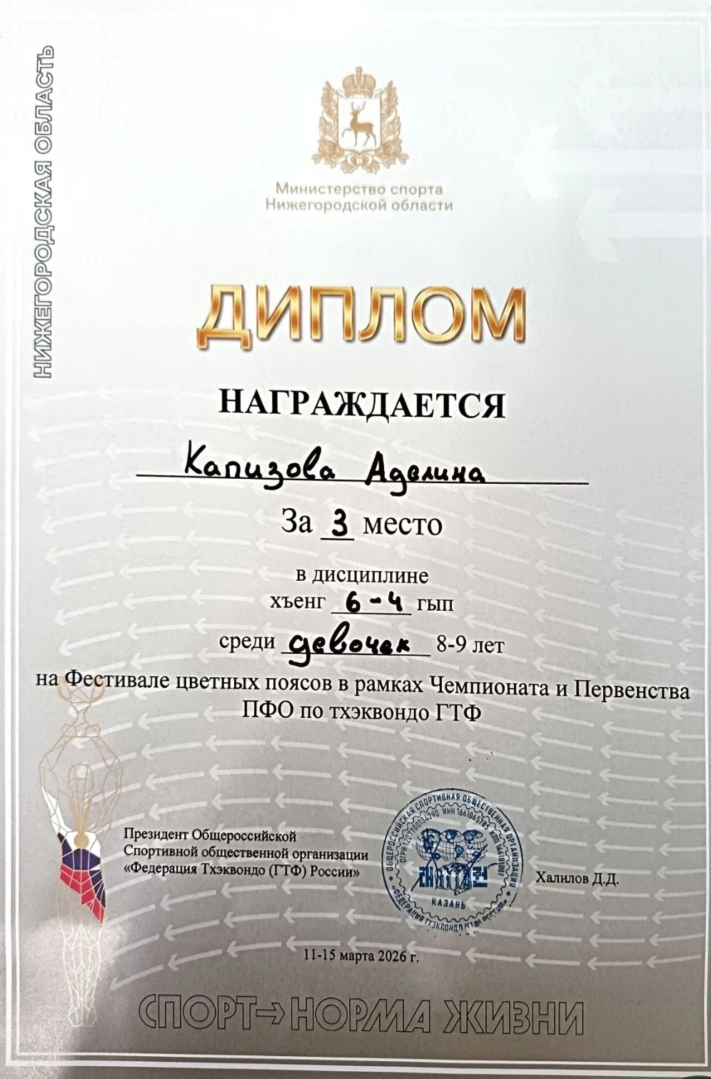 В марте в Нижнем Новгороде прошел Чемпионат и первенство Приволжского федерального округа по тхэквондо. Именно на таком уровне, выступив сверхдостойно для своего возраста и показав высокое мастерство владения тхэквондо, призером соревнований стала дочь начальника Оренбургского участка - Аделина Капизова. В дисциплине "демонстрация технических действий" среди спортсменок возрастной категории от 8 до 9 лет - Аделина заняла второе место. А в дисциплине "хъенг" в своей возрастной категории - 3 место. Поздравляем юную спортсменку с серебром и бронзой масшатбного и высокого уровня соревнований по тхэквондо, и радуемся за большие спортивные успехи в семье нашего коллеги! Желаем Аделине продолжать повышать мастерство и уровень результатов, ждем новых спортивных достижений и будем рады вновь увидить юную спортсменку на пьедестале почета!